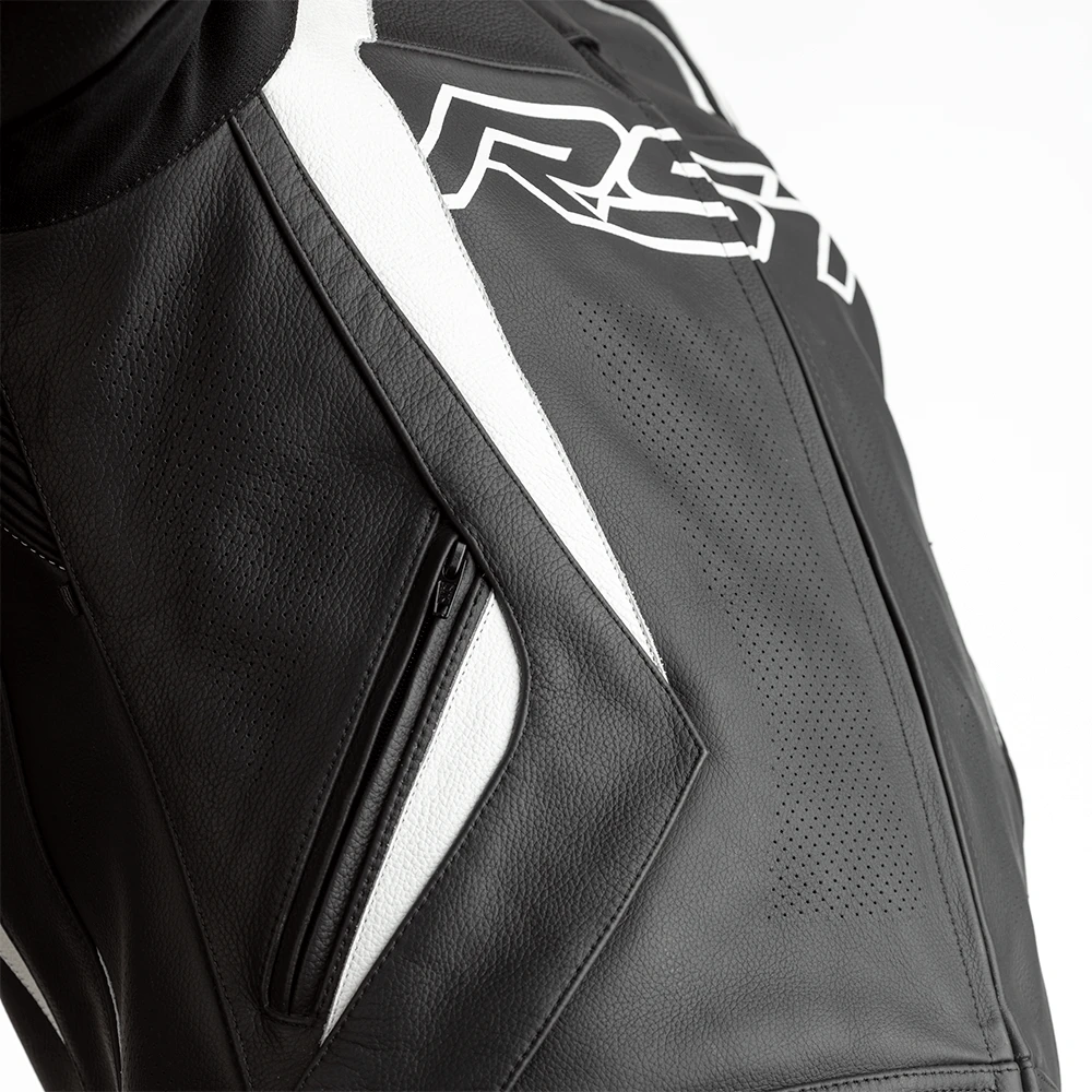 RST TracTech Evo 4 Leather Jacket White CE Approved -Trail Blazers Gear 102357 rst tractech evo 4 leather jacket black white detail chest 1 3