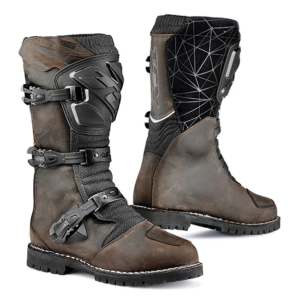 Drifter Waterproof adventure boots, manufactured with the traditional ‘Ideal’ construction, which features double seam and an intermediate insole to increase sturdiness. Made of full-grain leather with T-DRY waterproof membrane, for use in all conditions, vintage-effect pull-up finish and microfiber inserts. The reinforced polyurethane inserts on the shin, ankle, toe and heel, as well as the protection on the gear area, guarantee maximum safety. In the inner area, the boots are equipped with a suede protection against the heat of the motorcycle. To enhance comfort and flexibility of fit, the boots have been equipped with microfiber front and rear bellows. The closure system consists of three aluminum levers – wear-resistant, interchangeable and ergonomically designed – which facilitate the fastening and unfastening of the boots. The sole with tessellated tread is designed to ensure maximum grip on all surfaces, for use ranging from asphalt to dirt roads. They feature insoles with OrthoLite® technology that perfectly cushions all movements and offers high levels of breathability.