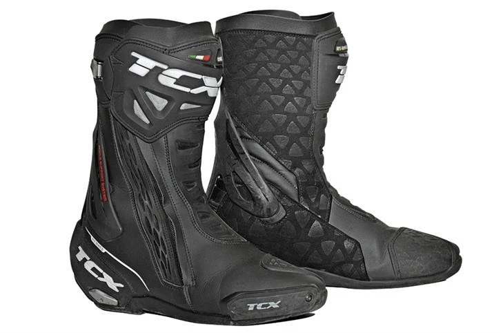 The RT-Race motorcycle boot is the protective, lightweight sports boot designed for maximum safety and optimal bike control. RT-Race incorporates Fasten Fit Control, an internal lacing system connected to the boot lining through a quick-slide lace so that the upper can wrap around the foot as much as possible and the fit can be personalized right down to the millimeter. The boot fastening system features an aluminum lever with micrometric adjustment and quick release, designed so that the shaft can adapt perfectly to various calf shapes and a side zipper with a stretch panel. TCX RT-Race motorcycle boots are equipped with the anti-twist Double Flex Control system, a polyurethane joint in the ankle area able to control movement down to the millimeter, offering ideal joint support and flexibility, to prevent dangerous twisting and the risk of injury. The upper is made of highly wear-resistant microfiber.The inner lining is made of breathable AIR TECH mesh fabric and has padding with different thicknesses in the ankle area to offer maximum comfort. There are interchangeable polyurethane sliders on the toe and heel to aid sliding when in contact with the asphalt. There are more reinforcements in the most exposed areas, such as the shin, ankle, toe, and heel.